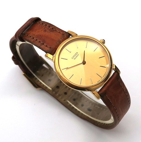 Citizen Quartz, klassisk damearmbåndsur, ref. nr. SE0102 i urkasse af guldtonet stål. Champagnefarvet skive med stregindikation. Quartzværk. Urkasse diameter 27 mm. Krone prydet med onyx. Læderrem med metalspænde.