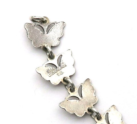 Dansk armlænke af sterling sølv med led i form af emaljedekorerede sommerfugle, L. 16,5 cm.