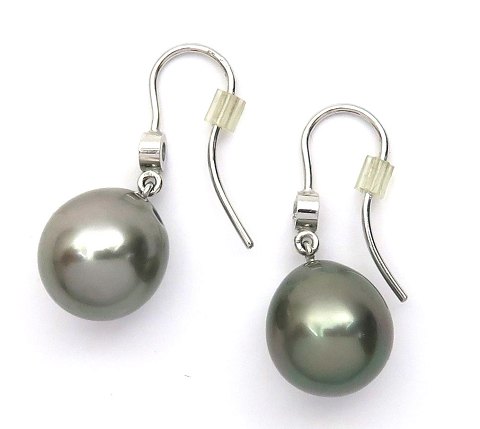 Par South Sea perle ørelokker med dråbeformede 13½ mm. southsea perler, prydet med to brillantslebne diamanter, tilsammen 0,20 ct. Udført i 14 kt guld