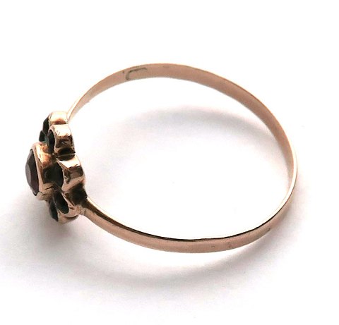 Ring af 14 kt. guld, prydet med større granat, omkranset af 8 mindre granater. Ring Str. 57½, samlet vægt ca. 1,3 gr.