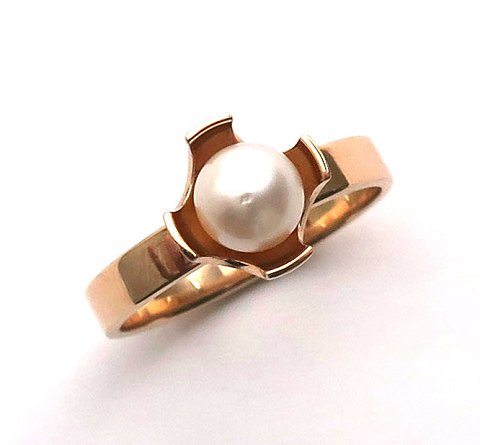 Ring af 14 kt. guld med forhøjet front, prydet med 6 mm. kulturperle i åben fatning. Ring Str. 54. Design Sandberg Danmark.