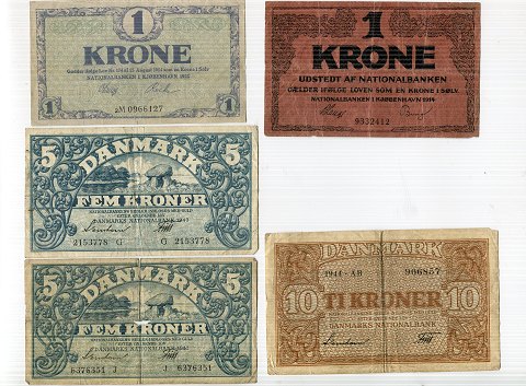 Danske pengesedler. 1 kr., 5 kr., 10 kr. 1914 ~ 1949 (9)