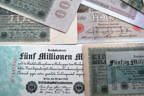 Samling tyske sedler fra inflationstden, de fleste sedler fra 1922 og 1923. Desuden 2x 1000 Mark 1910 og 100 Mark 1935 samt 50 Mark 1933.