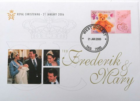 Kgl. prinsessedåb 2007 samleralbum med møntbrev 20 kr. 2003, postfrisk helark 50 Cents Australien *Kronprins Frederik og kronprinsesse Marys første besøg i Australien 2005 samt talrige førstedagskuverter med motiver fra det danske Konghus.