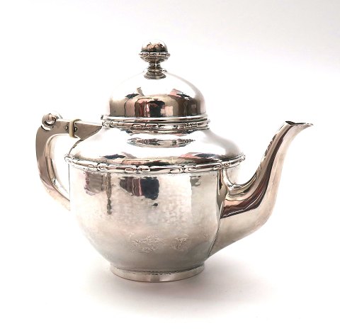 Dansk thékande af sølv med lethamret korpus og lågknob med omløbende art déco dekoration. Svunget hank med ben samlingerne. Heimbürger, København 1916. H. 18,5 cm., vægt ca. 475 gr.