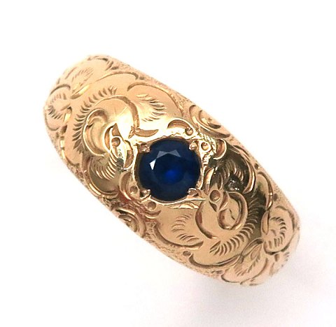 Herrering af 14 kt. guld med ornamenteret skinne, prydet med facetsleben, blå safir. Ring Str. 70. Samlet vægt ca. 12 gr.