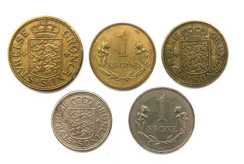 25 øre 1926, 1 kr. 1926, 1957 og 1960, 5 kr 1944.