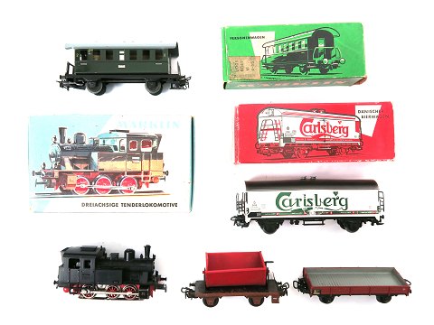 Lot beståend af elektrisk tenderlokomotiv 3029, personvogn 4000 og Carlsberg godsvogn 4636, begge i æske, samt flad godsvogn og tipvogn. Bortset fra sidstnævnte er alt velholdt.