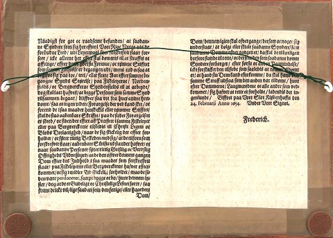 Frederik III, indrammet forordning fra 24. Februarii 1654 om *Leyermaal i de forbundne Leed ud i Norge - tegnet Frederich. Forside indrammet med passepartout , resten af forordningen opklæbt på bagsiden. 27 x 16 cm.