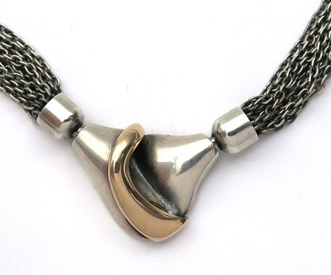 N. E. From collier bestående af 10 radet ankerkæde med enkelte, forgyldte tøndeled. Aftagelig vedhæng med forgyldt front. Kæde L. 39 cm., samlet vægt ca. 36 gr.