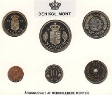 Møntsættet indeholder samtlige mønter i Danmarks møntserie: 10-, 5-, og 1-kr samt 25-, 10- og 5 øre.