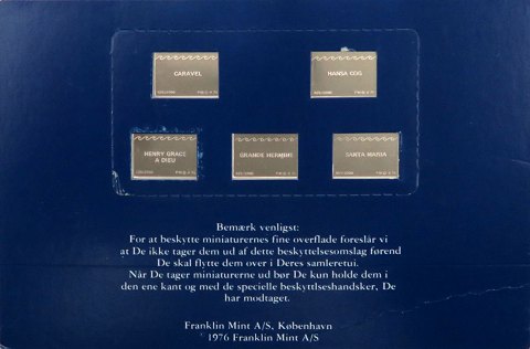 5 sølvbarrer af sterling sølv, præget med historiens store sejlskibe, monteret i forseglet kort. Samlet vægt ca. 25 gr.
