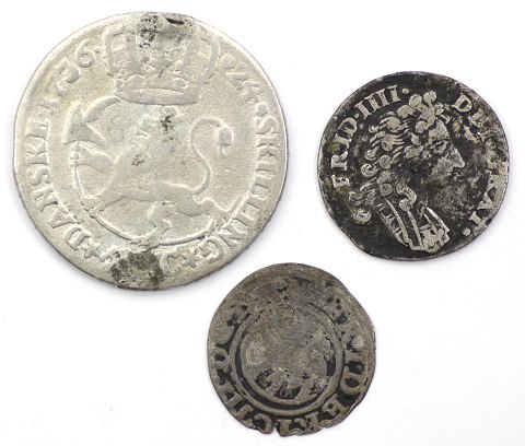 Norge, 2 skilling 1649 Sieg 2.1 H 70A, 8 skilling 1710 Sieg 3.2 H 6B, 24 skilling 1736 C, Sieg 4.2 H 4B(loddespor)