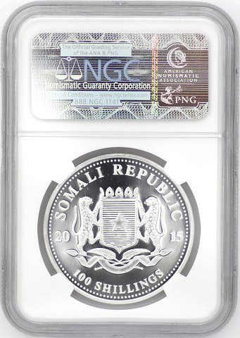 Somalia, 100 Schillings 2015 finsølv *Elephant* - MS69 certificeret
