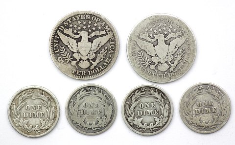 USA, 10 og 25 Cents (Barber Dimes & Quartes) 10 cents 1892, 1907, 1908 og 1916 samt 25 cents 1910 og 1915(6)