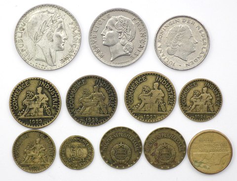 Frankrig, Holland og Ungarn. 50 Centimes, 1- og 2 Franc(Chambres de Commerce) 1921, 24 og 1925, 5 Franc 1935 og 20 Francs 1938(sølv), 2½ Gulden 1970 og 5 Gulden 1988 samt 2 Forint 1971 og 1981(12)