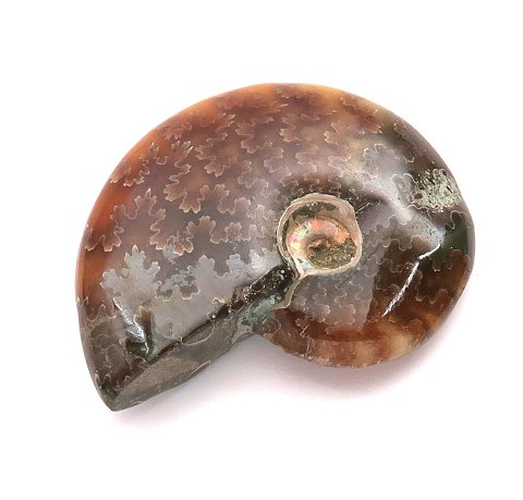 Fossil Ammonit, slebet og poleret til fremme for den strukturerede overflade. L. 4,8 cm. Fundsted: Madagaskar