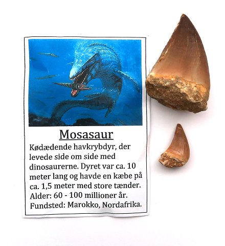 2 fossile tænder fra hav dinosauren ”Mosasaurus”, en daværende, ca. 10 mtr. lang kæmpe rovfisk.