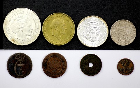 Lot bestående af 10 kr. 1972 sølv *Tronskiftet*, 2 kr 1957, 25 øre 1926 Grønland, ½ Dollar 1964 USA, Christian VII, ½ Skilling 1771, 2 øre 1929, 2 Kopek 1903 og ½ Kopek 1909, begge fra Rusland