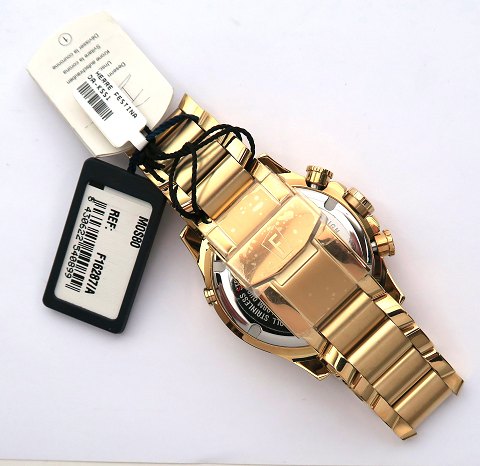 Festina Chrono Bike Alarm herrearmbåndsur, ref. F16287/A i urkasse og med lænke af guldtonet stål. Hvid/metalfarvet skive med stregindikation, central og separat sekundviser, datovisning i i #4 position, alarm og chronograph funktioner. Quartzværk. Urkasse diameter 44 mm.