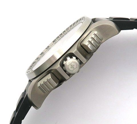 Fabriksnyt Victorinox, Swiss Army herrearmbåndsur, ref. nr. V25787 i urkasse af titanium. Sort skive bag safirglas med arabertal, lynette med tachymeter skala, central- og separat sekundviser, datovisning i #3½ position og chronograph funktioner. Quartzværk. Urkasse diameter 43 mm. Ægte gummilænke med metalspænde.