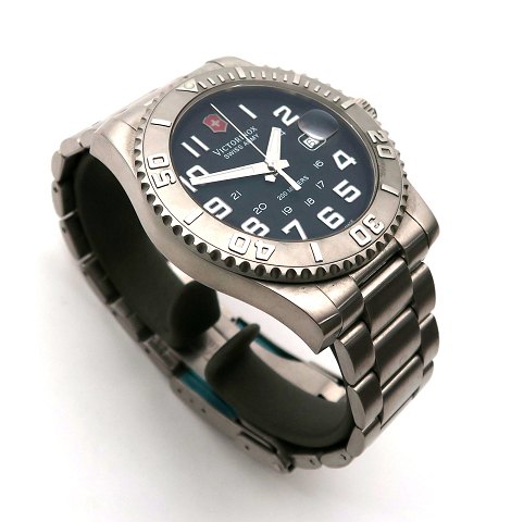 Victorinox Swiss Army herrearmbåndsur, ref. nr. V05080i urkasse og med foldelænke af stål. Sort skive bag safirglas med arabertal, 24 timer indikation, central sekundviser og datovisning i #3 position. Quartzværk. Urkasse diameter 43 mm.