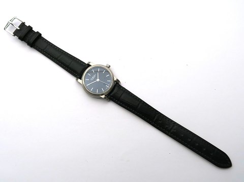 Ole Mathiesen Copenhagen, damearmbåndsur i urkasse af stål med sort skive og stregindikation. Schweizisk quartzværk. Urkasse diameter 30 mm. Læderrem med metalspænde.