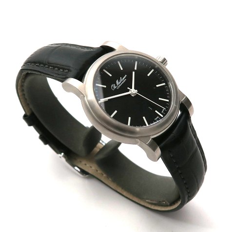 Ole Mathiesen Copenhagen, damearmbåndsur i urkasse af stål med sort skive og stregindikation. Schweizisk quartzværk. Urkasse diameter 30 mm. Læderrem med metalspænde.