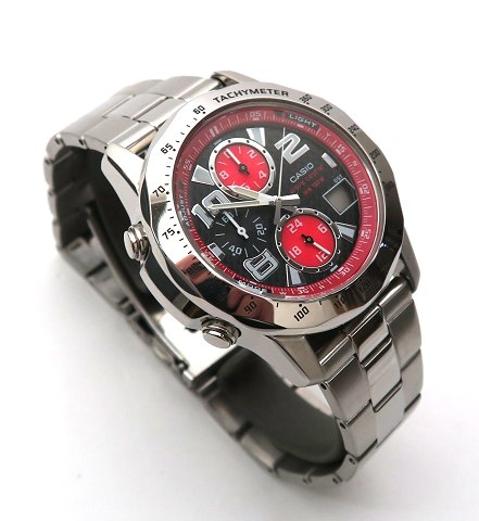 Casio Wave Ceptor herrearmbåndsur, ref. WVQ 550 i urkasse og med lænke af stål. Sort skive med rød krans, tachymeterskala, stregindikation og arabertal, central og separat sekundviser og chronograph funktioner samt digital datovisning. Quartsværk. Urkasse diameter 42 mm.