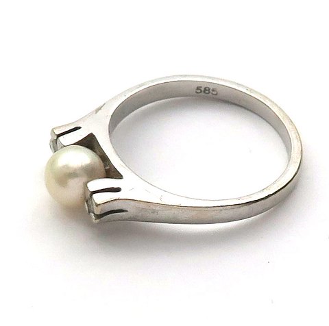 Ring af 14 kt. hvidguld med forhøjet skinne, prydet med 5½ mm. perle og 2 diamanter på tilsammen ca. 0,03ct. Ring Str. 53, samlet vægt ca. 3,3 gr.