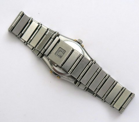Omega Constellation damearmbåndsur i urkasse og med lænke af stål. Champagnefarvet skive med stregindikation, krans med romertal. Quartzværk. Urkasse diameter 23 mm.