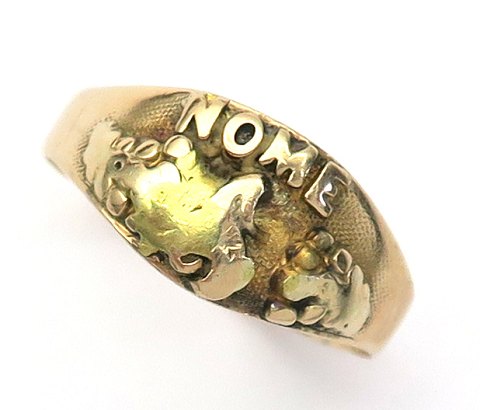Ring af 14 kt. guld, skinne prydet med "nuggets" og navnet på Alaskas guldgraverby Nome. Indvendig stemplet Suter Nome 14 kt. Ring Str. 61, vægt ca. 3,2 gr.