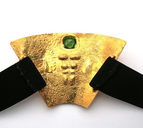 Unika kravepynt af 18 kt. guld, profileret front prydet med facetsleben turmalin. Monteret i kravebånd med metalspænde. 85 x 55 mm., vægt ca. 53 gr. Stemplet G 750
