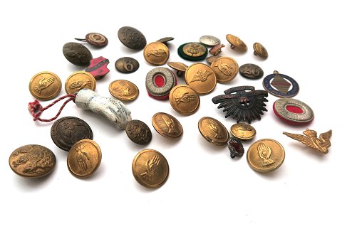 Samling uniformsemblemer, –knapper, -emblemer samt nåle m.m. (38)