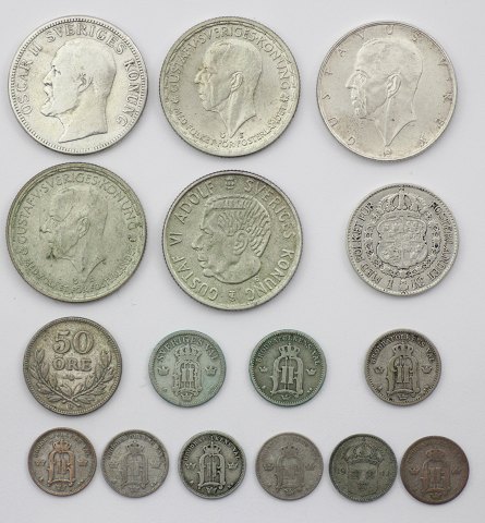 Sverige, 10, 25, 50 øre samt 1 og 2 kr. 1876 ~ 1958 sølv (16)