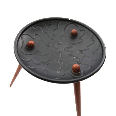 Retro blomsterbord med dekoreret, skålformet plade af stentøj på tre ben af teaktræ. Skål diameter 30 cm., H. 38 cm.