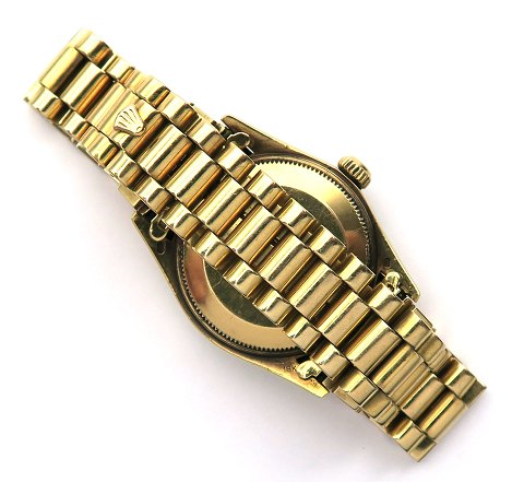 Rolex Datejust damearmbåndsur, ref. nr. 6827 med urkasse og lænke af 18 kt. guld. Lynette eftermonteret med brillantslebne diamanter, samlet ca. 0,50 ct. samt 4 baquetteslebne, blå safirer. Renoveret mørkeblå skive med diamantbesat indikation, central sekundviser og datovisning i #3 position. Automatisk værk. Urkasse diameter 30 mm. Samlet vægt ca. 90 gr.