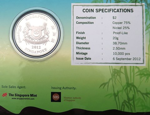 Singapore, 2 Dollar cn 2012 prooflike i blistermappe. Diameter 38,7 mm., præget i 10.000 eksemplarer.