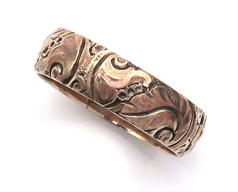 Skønvirke ring af 8 kt. rødguld, skinne dekoreret med volutter og bladværk. Ring Str. 62. Indvendig med inskription og dato. Vægt ca. 5 gr.