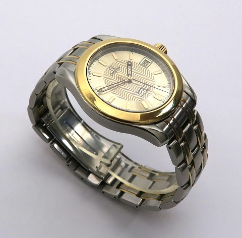 Omega Seamaster Automatic herrearmbåndsur, ref. nr. 168.1601 i urkasse og med foldelænke af guld/stål. Champagnefarvet, struktureret skive med stregindikation, central sekundviser og datovisning i #3 position. Automatisk værk cal. 1120. Urkasse diameter 35 mm. Uret er i dec. 2014 blevet fuld serviceret for kr. 4200.- Omega servicecertifikat samt to ekstra lænkeled medfølger.