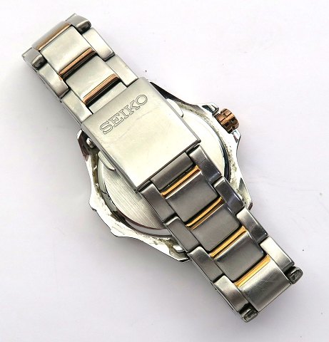 Seiko damearmbåndsur, ref. nr. 6N76-00F0 i urkasse af stål og med foldelænke af delvist guldtonet stål. Krans prydet med talrige, klare facetslebne sten. Metalgrå struktureret skive bag safirglas med stregindikation, central sekundviser og datovisning i #6 position. Quartzværk, urkasse diameter 36 mm.