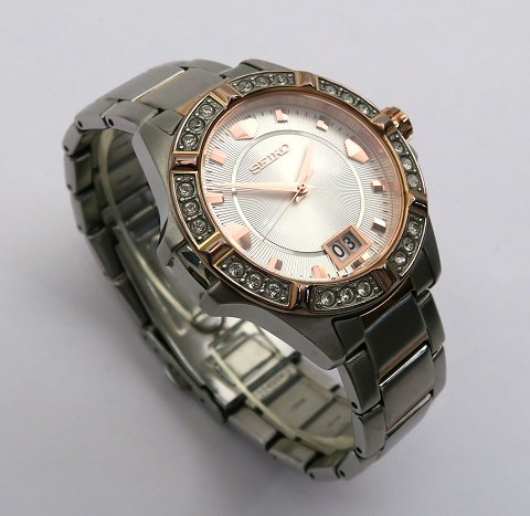 Seiko damearmbåndsur, ref. nr. 6N76-00F0 i urkasse af stål og med foldelænke af delvist guldtonet stål. Krans prydet med talrige, klare facetslebne sten. Metalgrå struktureret skive bag safirglas med stregindikation, central sekundviser og datovisning i #6 position. Quartzværk, urkasse diameter 36 mm.