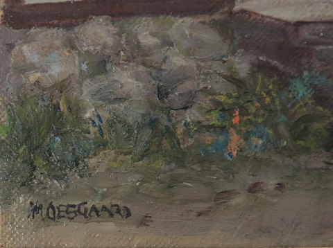 E. Rosengreen (20. årh.) signeret oliemaleri på lærred med eksteriørmotiv fra Moesgaard. 18 x 20 cm.