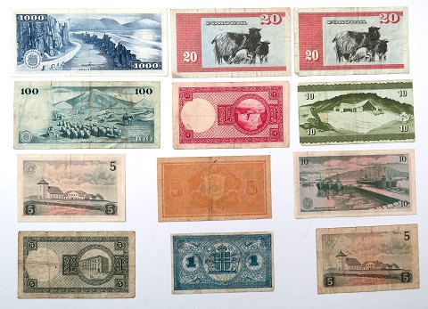 Færøerne og Island, samling sedler 1, 5, 10, 20, 100 og 1000 Krónur (12)