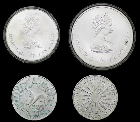 Lot beståede af Tyskland, 2x 10 Mark 1972 sølv (.625) samt Canada 5 og 10 Dollars *Montreal 1976* sterling sølv.