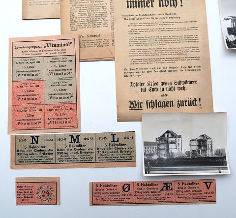 Lot bestående af 2 forskellige RAF propaganda flyveblade, nedkastet over Tyskland, 2 illegale blade fra modsatndsbevægelsen, Christian X Kongesangbog, rationeringsmærker samt 4 s/h fotos med motiver fra Aarhus: Gestapos bombede hovedkontor ved Aarhus Universitet, bombet motortog Aarhus - Riskov, sprængt ammunitionstog ved Aarhus godsbanen og Guldmedegade efter bombardement.