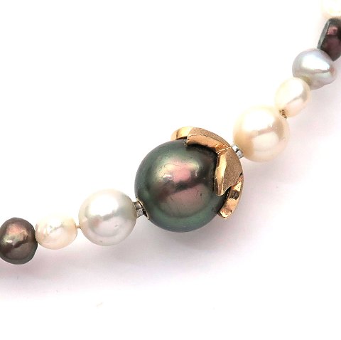 Birgitte Munch halssmykke med ferskvandsperler i hvide, grå og påfuglefarvede nuancer. Perlelås prydet med bladværk af 14 kt. guld. L. 47 cm., samlet vægt ca. 35 gr.