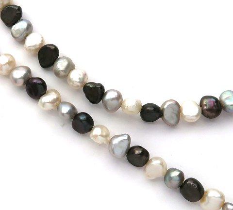 Birgitte Munch halssmykke med ferskvandsperler i hvide, grå og påfuglefarvede nuancer. Perlelås prydet med bladværk af 14 kt. guld. L. 47 cm., samlet vægt ca. 35 gr.