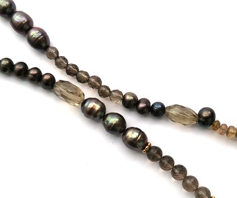 Birgitte Munch halssmykke med påfuglefarvede ferskvandsperler og facetslebne sten, hvorimellem rosetter af 13 kt. guld. Perlelås prydet med bladværk af 14 kt. guld. L. 47 cm., samlet vægt ca. 50 gr.