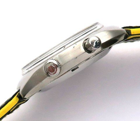 Omega Genève Chronostop herrearmbåndsur, ref nr. 145.010 i urkasse af stål, sort urskive med sort/hvide minut- og timevisere, central rød sekundviser. Manuelt mekanisk optræksværk cal. 865. Urkasse 33 x 38 mm. Læderrem i gul og sort med Omega metalspænde.